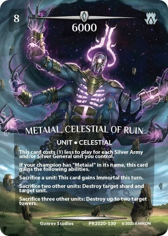 If your champion has "Metaial" in its name, this card gains the following abilities. Sacrifice a unit: This card gains Immortal this turn. Sacrifice two other units: Destroy target shard and target unit. Sacrifice three other units: Destroy up to two target towers. |