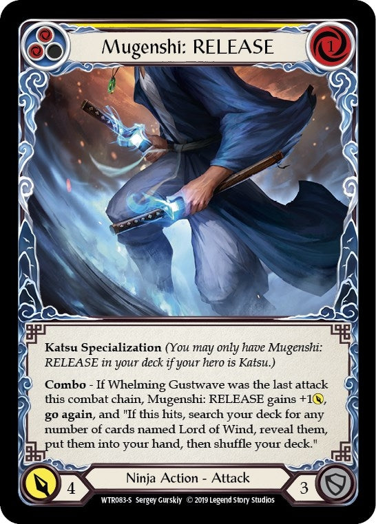 Combo - If Whelming Gustwave was the last attack this combat chain, Mugenshi: RELEASE gains +1 [Power], go again, and "If this hits, search your deck for any number of cards named Lord of Wind, reveal them, put them into your hand, then shuffle your deck." - Card Type: Action