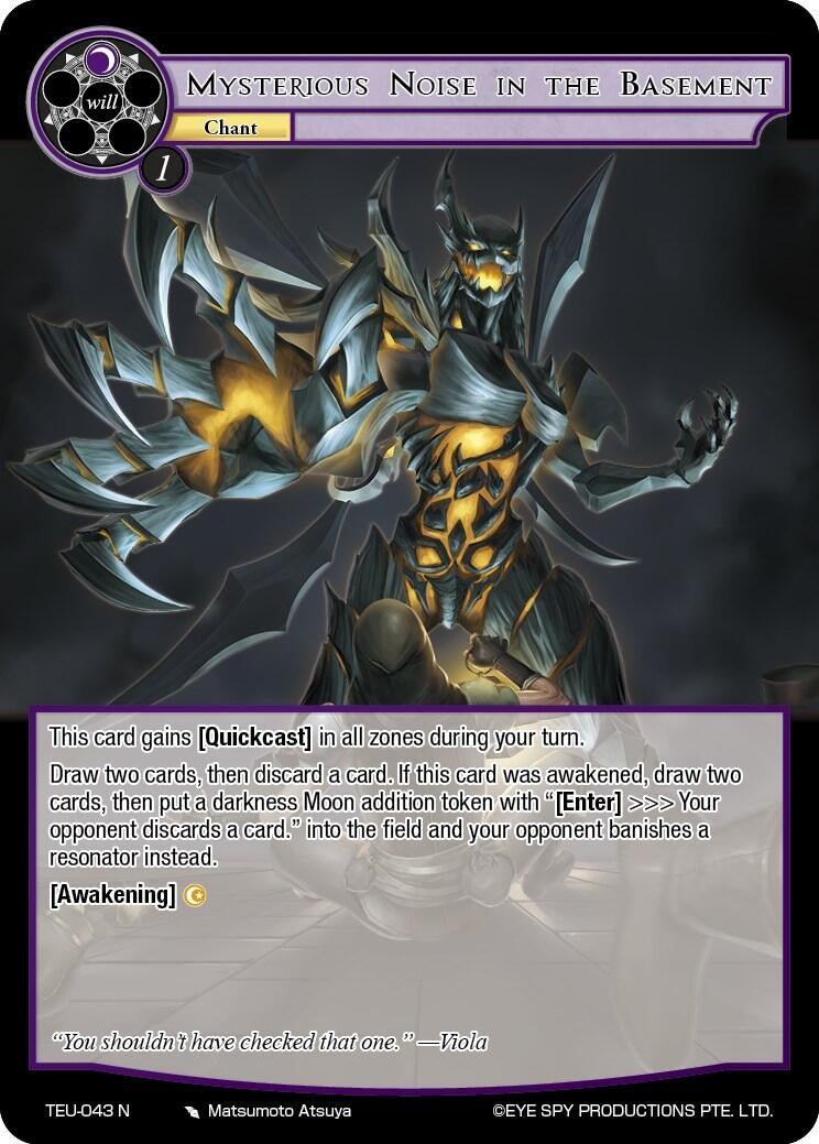 Draw two cards, then discard a card. If this card was awakened, draw two cards, then put a darkness Moon addition token with "[Enter] >>> Your opponent discards a card." into the field and your opponent banishes a resonator instead. [Awakening] M |