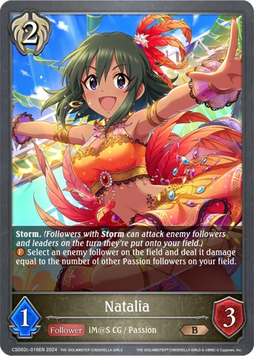 Storm.(Followers with Storm can attack enemy followers and leaders on the turn they're put onto your field.) [Fanfare] Select an enemy follower on the field and deal it damage equal to the number of other Passion followers on your field. |