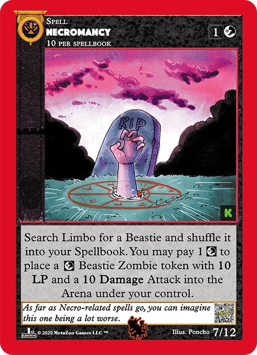 Search Limbo for a Beastie and shuffle it into your Spellbook. You may pay 1 Dark Aura to place a Dark Aura Beastie Zombie token with 10 LP and a 10 Damage attack into the Arena under your control.