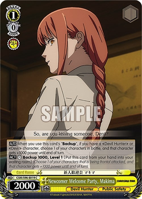 | Card Text: | [AUTO] When you use this card's "Backup", if you have a "Devil Hunter" or "Devil" character, choose 1 of your characters in battle, and that character gets +1000 power until end of turn. [ACT] [COUNTER] Backup 1000, Level 1 [Put this card from your hand into your waiting room] (Choose 1 of your characters that is being frontal attacked, and that character gets +1000 power until end of turn) |