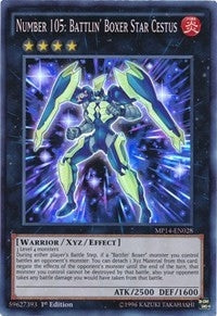 Description: | 3 Level 4 monsters During either player's Battle Step, if a "Battlin' Boxer" monster you control battles an opponent's monster: You can detach 1 Xyz Material from this card; negate the effects of the opponent's monster until the end of the turn, that monster you control cannot be destroyed by that battle, also your opponent takes any battle damage you would have taken from that battle. |