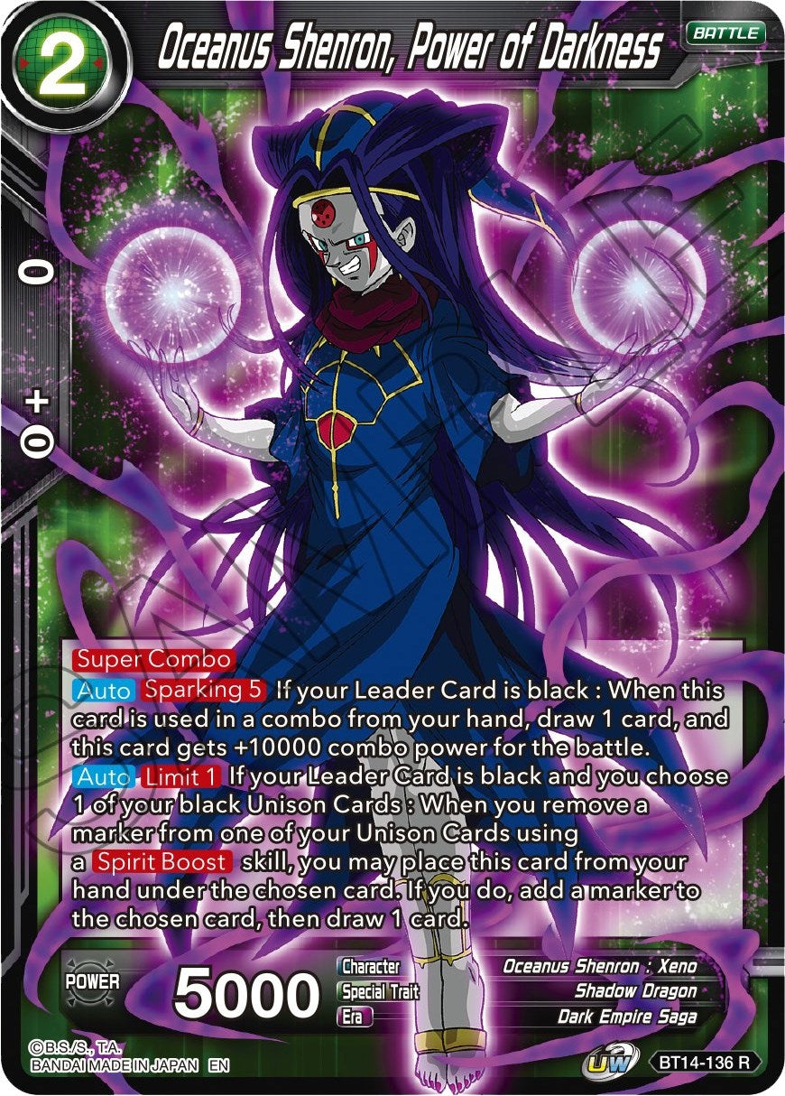 [Auto] [Sparking 5] If your Leader Card is black : When this card is used in a combo from your hand, draw 1 card, and this card gets +10000 combo power for the battle. [Auto] [Limit 1] If your Leader Card is black and you choose 1 of your black Unison Cards : When you remove a marker from one of your Unison Cards using a [Spirit Boost] skill, you may place this card from your hand under the chosen card. If you do, add a marker to the chosen card, then draw 1 card. |