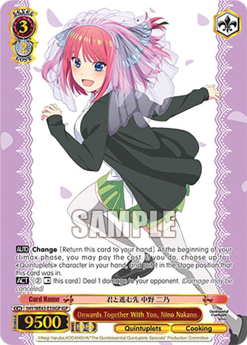 Card Text: | [AUTO] Change [Return this card to your hand] At the beginning of your climax phase, you may pay the cost. If you do, choose up to 1 "Quintuplets" character in your hand, and put it in the stage position that this card was in. [ACT] [(2)(Damage may be canceled) |