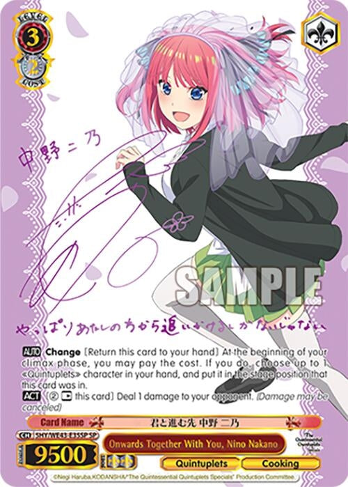 Card Text: | [AUTO] Change [Return this card to your hand] At the beginning of your climax phase, you may pay the cost. If you do, choose up to 1 "Quintuplets" character in your hand, and put it in the stage position that this card was in. [ACT] [(2)(Damage may be canceled) |
