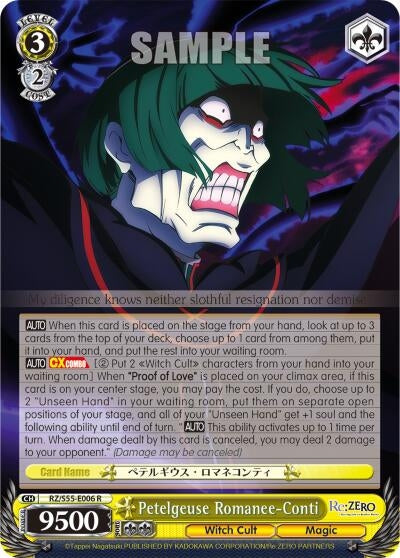 [AUTO] [CXCOMBO] [(2) Put 2 "Witch Cult" characters from your hand into your waiting room] When "Proof of Love" is placed on your climax area, if this card is on your center stage, you may pay the cost. If you do, choose up to 2 "Unseen Hand" in your waiting room, put them on separate positions of your stage, and all of your "Unseen Hand" get +1 soul and the following ability until end of turn. "[AUTO] This ability activates up to 1 time per turn. When damage dealt by this card is canceled, you may deal 2 damage to your opponent." (Damage may be canceled) |