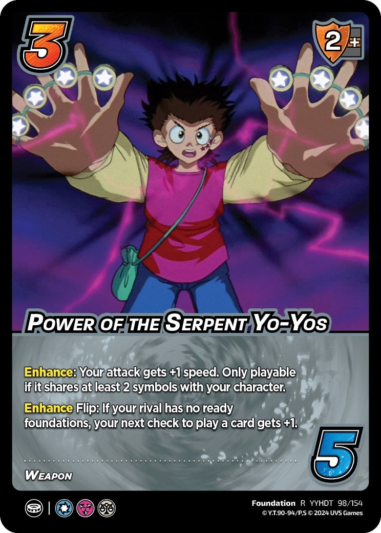 Enhance: Your attack gets +1 speed. Only playable if it shares at least 2 symbols with your character. Enhance Flip: If your rival has no ready foundations, your next check to play a card gets +1. |