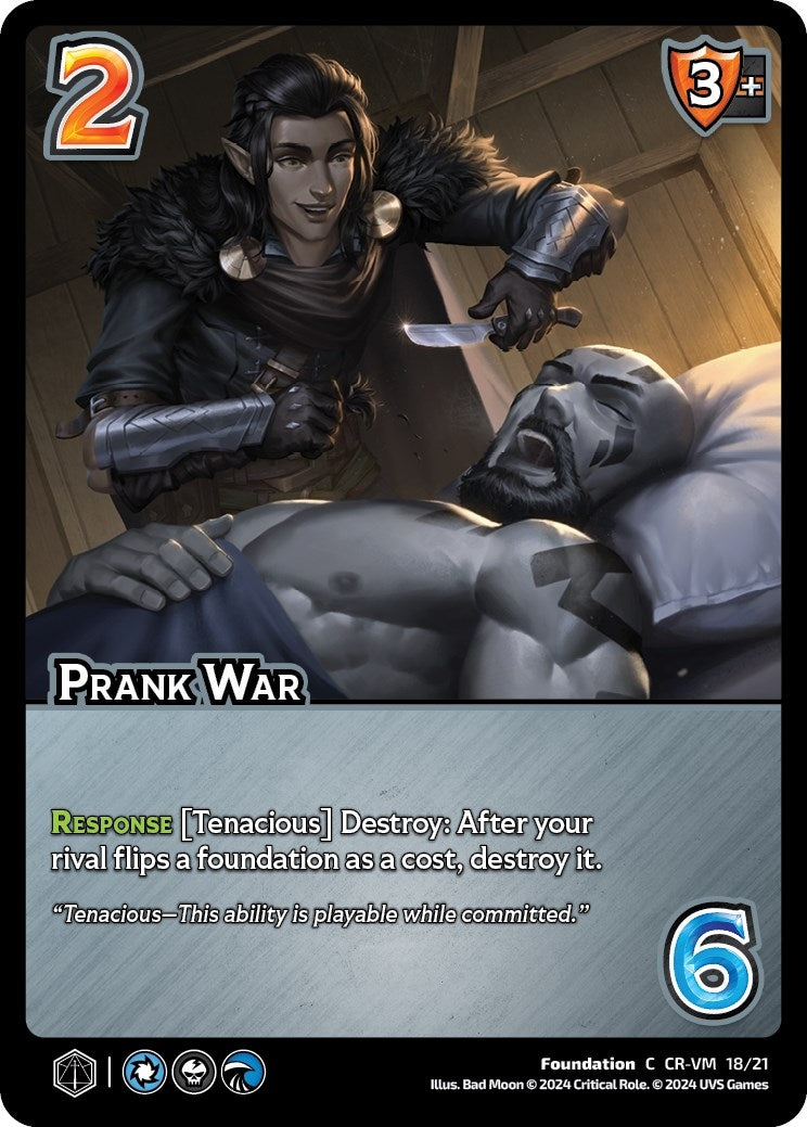 Response [Tenacious] Destroy: After your rival flips a foundation as a cost, destroy it. “Tenacious—This ability is playable while committed.” |