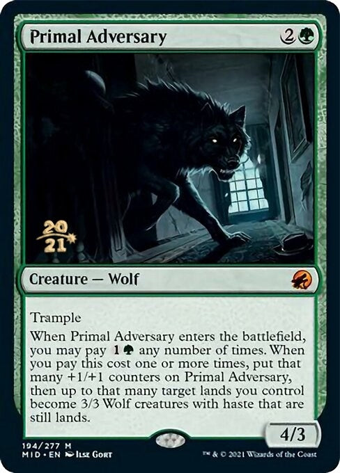 When Primal Adversary enters the battlefield, you may pay 1G any number of times. When you pay this cost one or more times, put that many +1/+1 counters on Primal Adversary, then up to that many target lands you control become 3/3 Wolf creatures with haste that are still lands. |