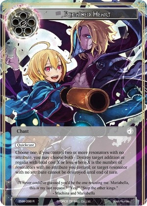 Choose one, if you control two or more resonators with no attribute, you may choose both - Destroy target addition or regalia with total cost X or less, where X is the number of resonators with no attribute you control; or target resonator with no attribute cannot be destroyed until end of turn. |