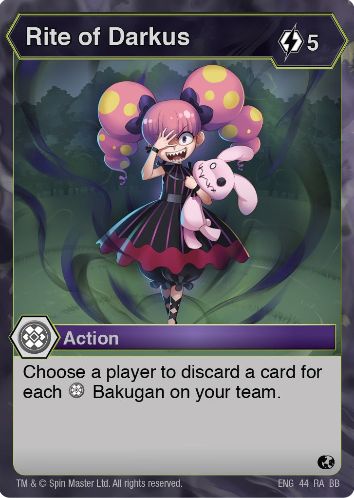 Description: | Choose a player to discard a card for each [Darkus] Bakugan on your team. |