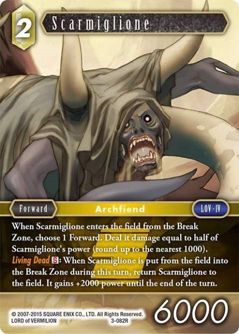 When Scarmiglione enters the field from the Break Zone, choose 1 Forward. Deal it damage equal to half of Scarmiglione's power (round up to the nearest 1000).
