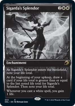 At the beginning of your upkeep, draw a card if your life total is greater than or equal to the last noted life total for Sigarda’s Splendor. Then note your life total. Whenever you cast a white spell, you gain 1 life. |