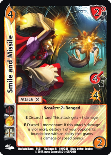 E Discard 1 momentum: If this attack's damage is 8 or more, destroy 1 of your opponent's foundations with an ability that grants a damage or speed bonus on it. E Discard 1 card: This attack gets +3 damage. |