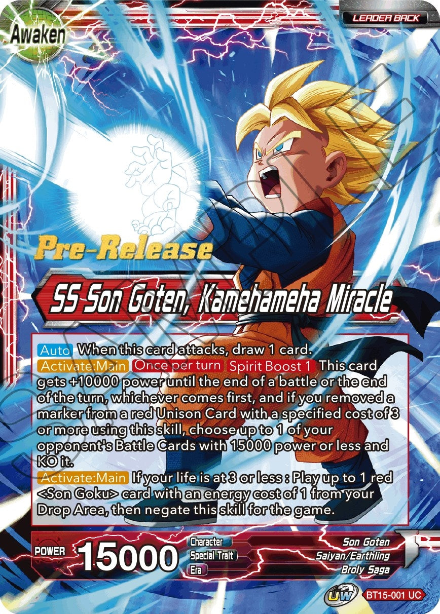 [Awaken] When your life is at 4 or less or you have a red Unison Card with a specified cost of 3 in play : You may draw 2 cards, add cards from your life to your hand until you have 6 life left, and flip this card over. SS Son Goten, Kamehameha Miracle [Auto] When this card attacks, draw 1 card. [Activate:Main] [Once per turn] [Spirit Boost 1] This card gets +10000 power until the end of a battle or the end of the turn, whichever comes first, and if you removed a marker from a red Unison Card with a specified cost of 3 or more using this skill, choose up to 1 of your opponent's Battle Cards with 15000 power or less and KO it. [Activate:Main] If your life is at 3 or less : Play up to 1 red "Son Goku" card with an energy cost of 1 from your Drop Area, then negate this skill for the game. |