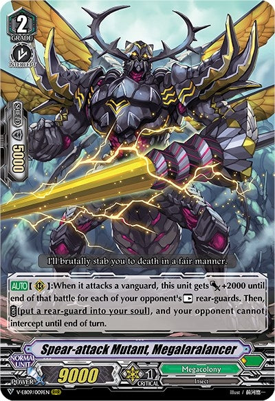 [AUTO](RC):When it attacks a vanguard, this unit gets [Power] +2000 until end of that battle for each of your opponent's [Rest] rear-guards. Then, [COST][put a rear-guard into your soul], and your opponent cannot intercept until end of turn.