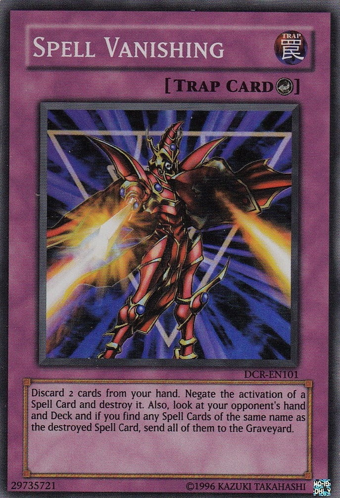 Description: | Discard 2 cards from your hand to negate the activation of a Spell Card and destroy it. Also, check your opponent''s hand and Deck and if you find any Spell Cards of the same name as the destroyed Spell Card, send all of them to the Graveyard. |