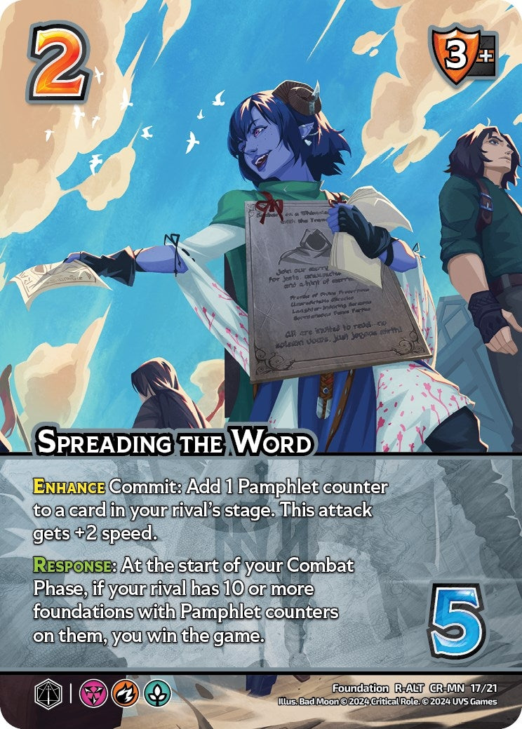 Enhance Commit: Add 1 Pamphlet counter to a card in your rival’s stage. This attack gets +2 speed. Response: At the start of your Combat Phase, if your rival has 10 or more foundations with Pamphlet counters on them, you win the game. |