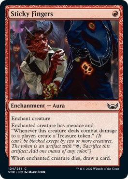Enchanted creature has menace and "Whenever this creature deals combat damage to a player, create a Treasure token." (It can't be blocked except by two or more creatures. The token is an artifact with "T, Sacrifice this artifact: Add one mana of any color.") When enchanted creature dies, draw a card. |