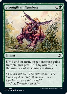 | Rules Text Contains: | Until end of turn, target creature gains trample and gets +X/+X, where X is the number of attacking creatures. |