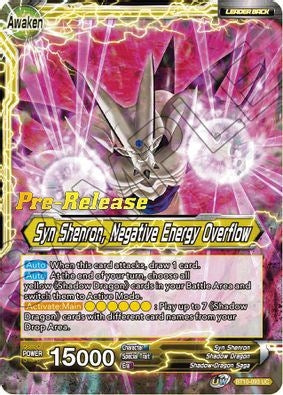 [Auto] At the end of your turn, choose up to 1 yellow "Shadow Dragon" card in your Battle Area and switch it to Active Mode. [Awaken] When your life is at 3 or less, or you have a yellow Unison Card with a specified cost of 4 in play : You may draw up to 2 cards, then switch up to 1 of your energy to Active Mode and flip this card over. Syn Shenron, Negative Energy Overflow [Auto] When this card attacks, draw 1 card. [Auto] At the end of your turn, choose all yellow "Shadow Dragon" cards in your Battle Area and switch them to Active Mode. [Activate:Main] YYYYYY : Play up to 7 "Shadow Dragon" cards with different card names from your Drop Area. |