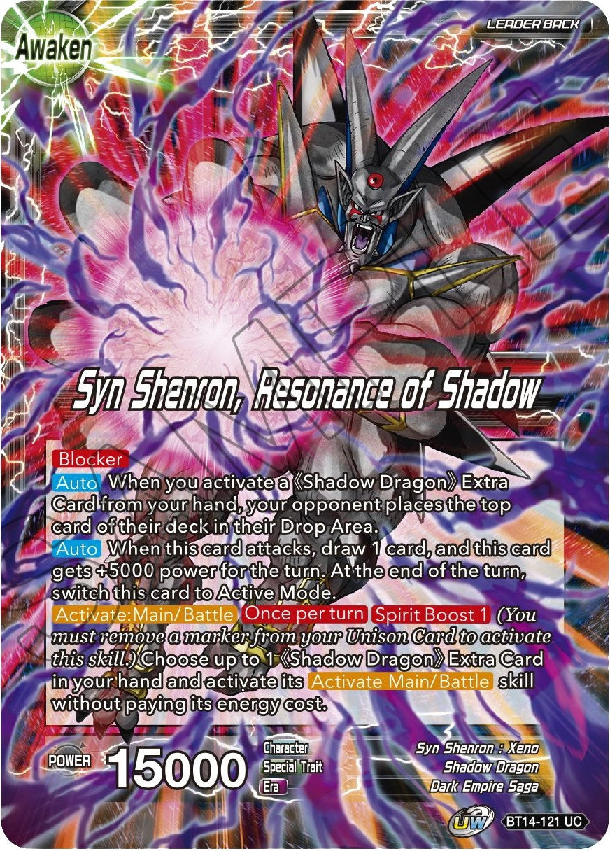 [Auto] When you activate a "Shadow Dragon" Extra Card from your hand, you and your opponent place the top card of your deck in your Drop Areas. [Auto] Choose 1 black "Shadow Dragon" card in your hand and discard it : when this card attacks, draw 1 card, then switch this card to Active Mode at the end of the turn. [Awaken] When your life is at 4 or less or 7 or more black "Shadow Dragon" cards are in your Drop Area : You may draw 1 card, switch up to 1 of your energy to Active Mode, and flip this card over. Syn Shenron, Resonance of Shadow [Blocker] [Auto] When you activate a "Shadow Dragon" Extra Card from your hand, your opponent places the top card of their deck in their Drop Area. [Auto] When this card attacks, draw 1 card, and this card gets +5000 power for the turn. At the end of the turn, switch this card to Active Mode. [Activate:Main/Battle] [Once per turn] [Spirit Boost 1] (You must remove a marker from your Unison Card to activate this skill.) Choose up to 1 "Shadow Dragon" Extra Card in your hand and activate its [Activate Main/Battle] skill without its energy cost. |