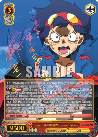 [AUTO] [CXCOMBO] [(1) Put a card from your hand into your waiting room] When this card's battle opponent becomes [REVERSE], if a card named "On My Back, In My Heart," is in your climax area, you may pay the cost. If you do, deal four damage to your opponent. (This damage may be canceled) [ACT] [(1) Put a card named "Kamina" from your memory face up underneath this card as a marker] Until the end of your opponent's next turn, this card gets +2500 power and the following ability. "[CONT] During this card's battle, your opponent cannot play "Backup" from hand." |