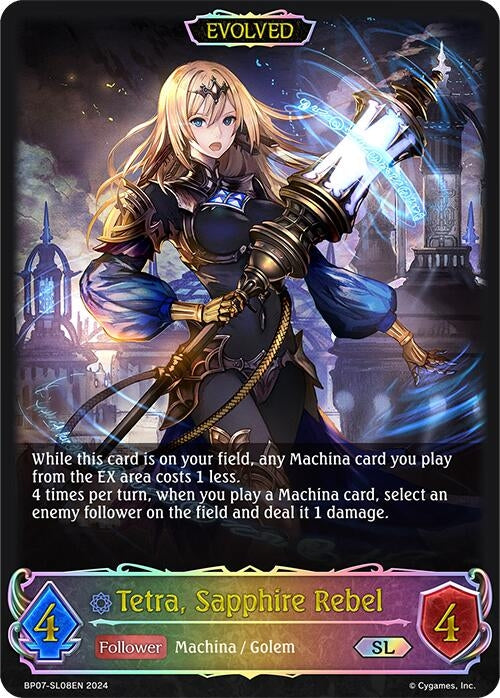 Description: | While this card is on your field, any Machina card you play from the EX area costs 1 less. 4 times per turn, when you play a Machina card, select an enemy follower on the field and deal it 1 damage. |