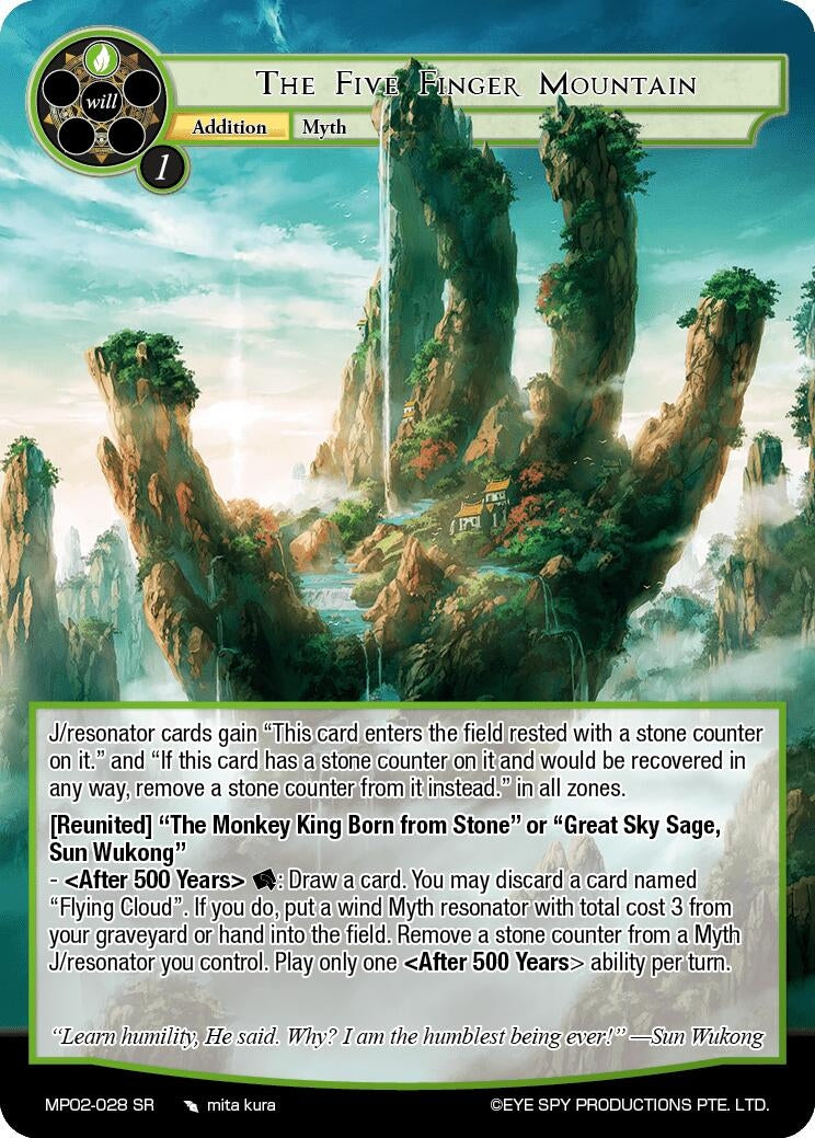 [Reunited] "The Monkey King Born from Stone" or "Great Sky Sage, Sun Wukong" - "After 500 Years" [Rest]: Draw a card. You may discard a card named "Flying Cloud". If you do, put a wind Myth resonator with total cost 3 from your graveyard or hand into the field. Remove a stone counter from a Myth J/resonator you control. Play only one "After 500 Years" ability per turn. |