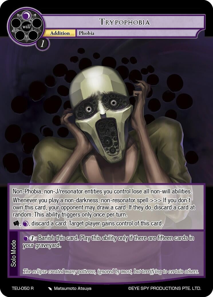 Rules Text Contains: | Non-Phobia, non-J/resonator entities you control lose all non-will abilities. Whenever you play a non-darkness, non-resonator spell >>> If you don't own this card, your opponent may draw a card. If they do, discard a card at random. This ability triggers only once per turn. [Rest],B, discard a card: Target player gains control of this card. [Solo Mode] B1: Banish this card. Play this ability only if there are fifteen cards in your graveyard. |