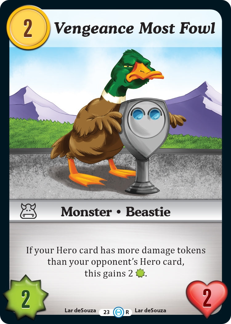 If your Hero card has more damage tokens than your opponent's Hero card, this gains 2 [power].