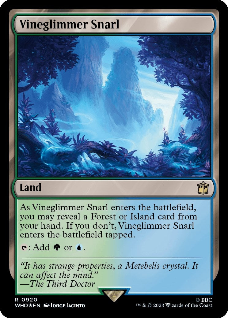 Rules Text Contains: | As Vineglimmer Snarl enters the battlefield, you may reveal a Forest or Island card from your hand. If you don't, Vineglimmer Snarl enters the battlefield tapped.