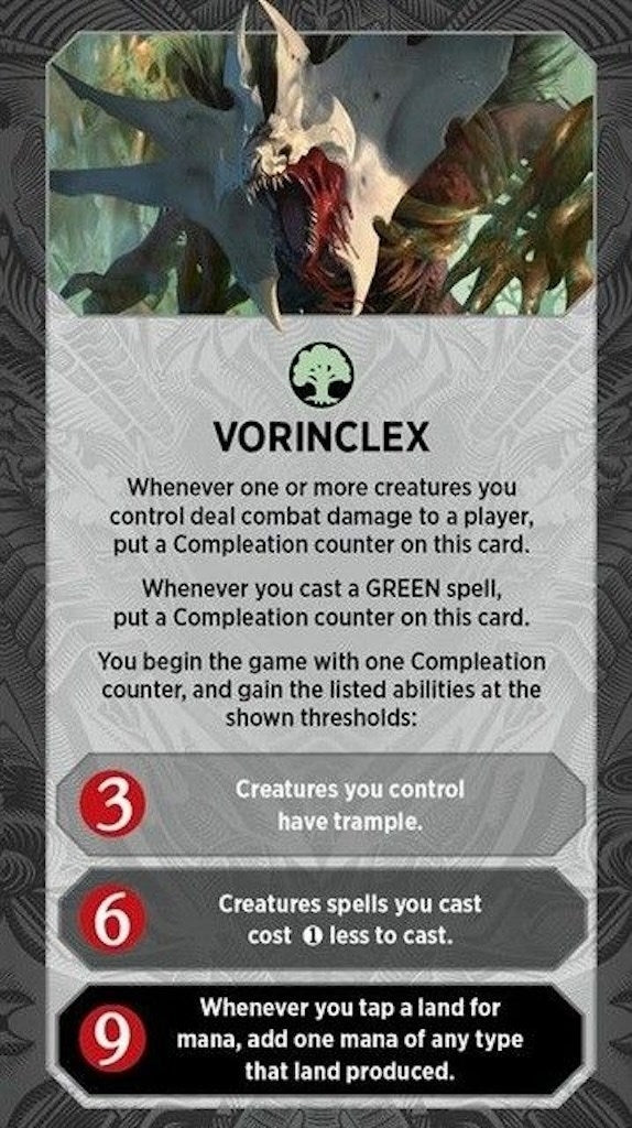 Whenever you cast a GREEN spell, put a Compleation counter on this card. You begin the game with one Compleation counter, and gain the listed abilities at the shown thresholds: (3) Creatures you control have trample. (6) Creature spells you cast cost 1 less to cast. (9) Whenever you tap a land for mana, add one mana of any type that land produced. |