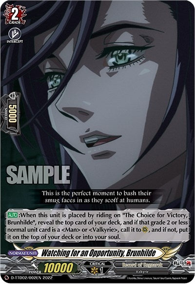 [AUTO]:When this unit is placed by riding on "The Choice for Victory, Brunhilde", reveal the top card of your deck, and if that grade 2 or less normal unit card is a "Man" or "Valkyrie", call it to (RC), and if not, put it on the top of your deck or into your soul.