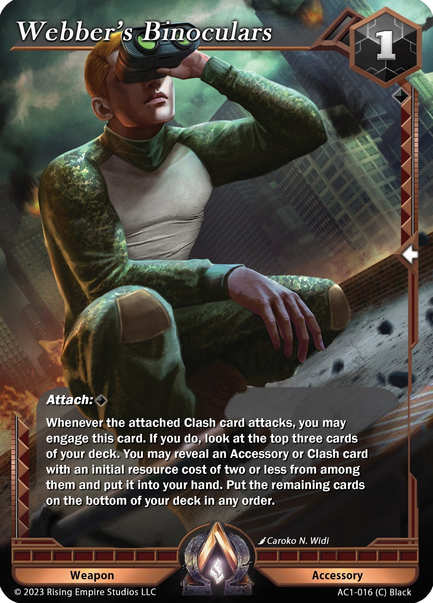Whenever the attached Clash card attacks, you may engage this card. If you do, look at the top three cards of your deck. You may reveal an Accessory or Clash card with an initial resource cost of two or less from among them and put it into your hand. Put the remaining cards on the bottom of your deck in any order.