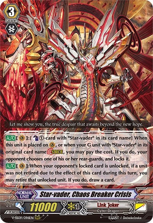Description: [AUTO](VC):[Counter Blast (1)-card with "Star-vader" in its card name] When this unit is placed on (VC), or when your G unit with "Star-vader" in its original card name Stride, you may pay the cost. If you do, your opponent chooses one of his or her rear-guards, and locks it.