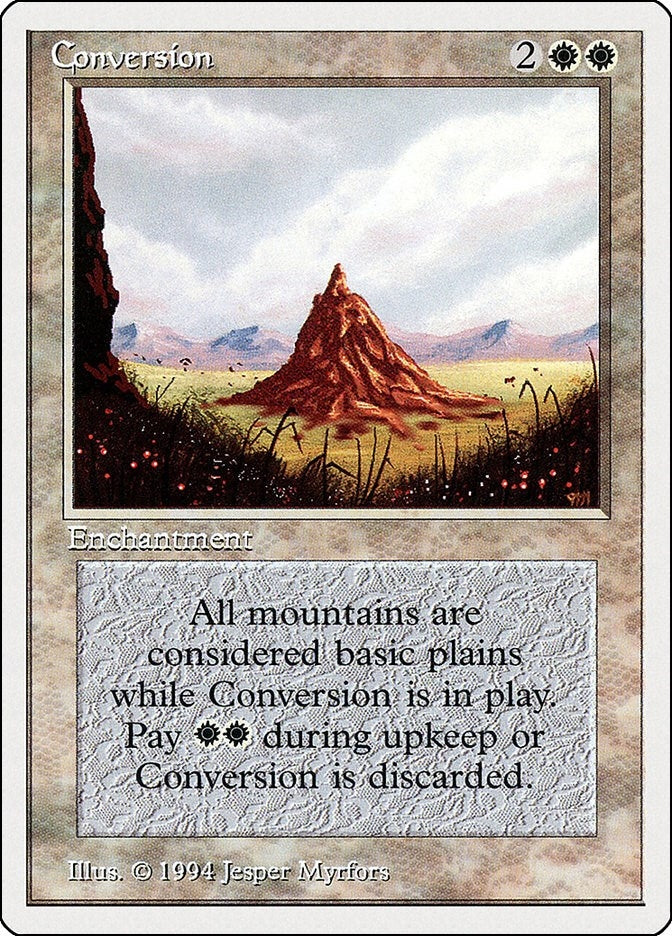 Rules Text Contains: All mountains are considered basic plains while Conversion is in play. Pay WW during upkeep or Conversion is discarded.