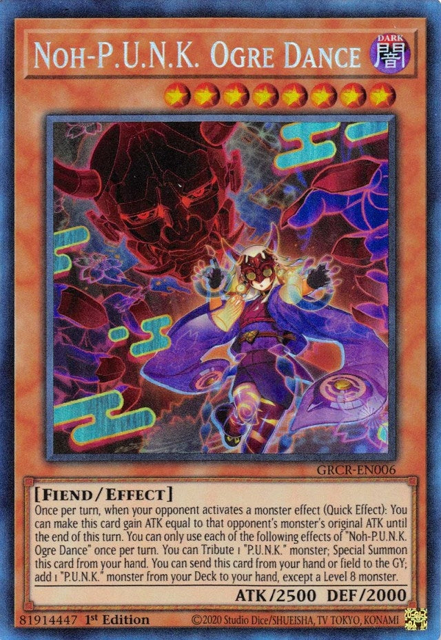 Once per turn, when your opponent activates a monster effect (Quick Effect): You can make this card gain ATK equal to that opponent's monster's original ATK until the end of this turn. You can only use each of the following effects of "Noh-P.U.N.K. Ogre Dance" once per turn. You can Tribute 1 "P.U.N.K." monster; Special Summon this card from your hand. You can send this card from your hand or field to the GY; add 1 "P.U.N.K." monster from your Deck to your hand, except a Level 8 monster.