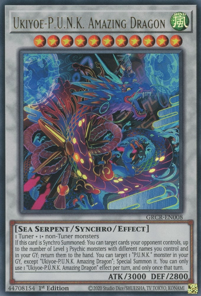If this card is Synchro Summoned: You can target cards your opponent controls, up to the number of Level 3 Psychic monsters with different names you control and in your GY; return them to the hand. You can target 1 "P.U.N.K." monster in your GY, except "Ukiyoe-P.U.N.K. Amazing Dragon"; Special Summon it. You can only use 1 "Ukiyoe-P.U.N.K. Amazing Dragon" effect per turn, and only once that turn. |