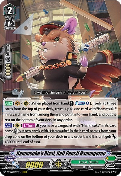 Description: | [AUTO](VC/RC):When placed from hand, [COST][Counter-Blast 1], look at three cards from the top of your deck, reveal up to one card with "Hammsuke" in its card name from among them and put it into your hand, and put the rest on the bottom of your deck in any order. [ACT](RC)[1/turn]:If you have a vanguard with "Hammsuke" in its card name, [COST][put two cards with "Hammsuke" in their card names from your drop zone on the bottom of your deck in any order], and this unit gets [Power] +3000 until end of turn. |