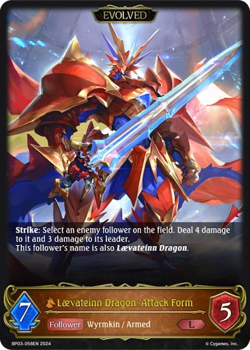 Strike: Select an enemy follower on the field. Deal 4 damage to it and 3 damage to its leader. This follower's name is also Laevateinn Dragon. |