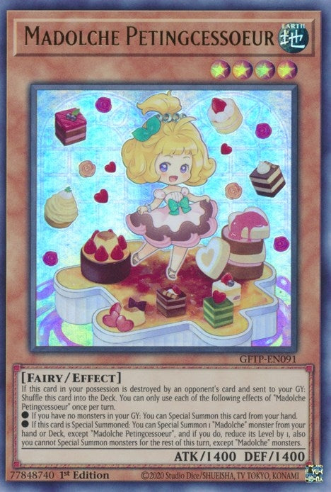 • If you have no monsters in your GY: You can Special Summon this card from your hand. • If this card is Special Summoned: You can Special Summon 1 "Madolche" monster from your hand or Deck, except "Madolche Petingcessoeur", and if you do, reduce its Level by 1, also you cannot Special Summon monsters for the rest of this turn, except "Madolche" monsters. |