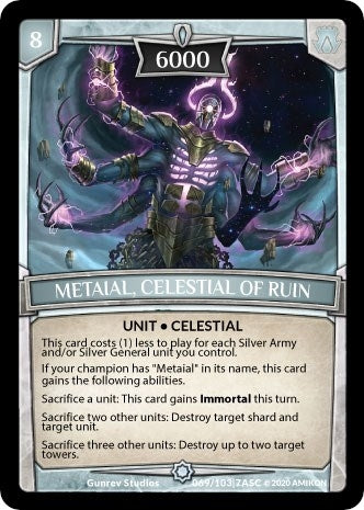 If your champion has "Metaial" in its name, this card gains the following abilities. Sacrifice a unit: This card gains Immortal this turn. Sacrifice two other units: Destroy target shard and target unit. Sacrifice three other units: Destroy up to two target towers. |