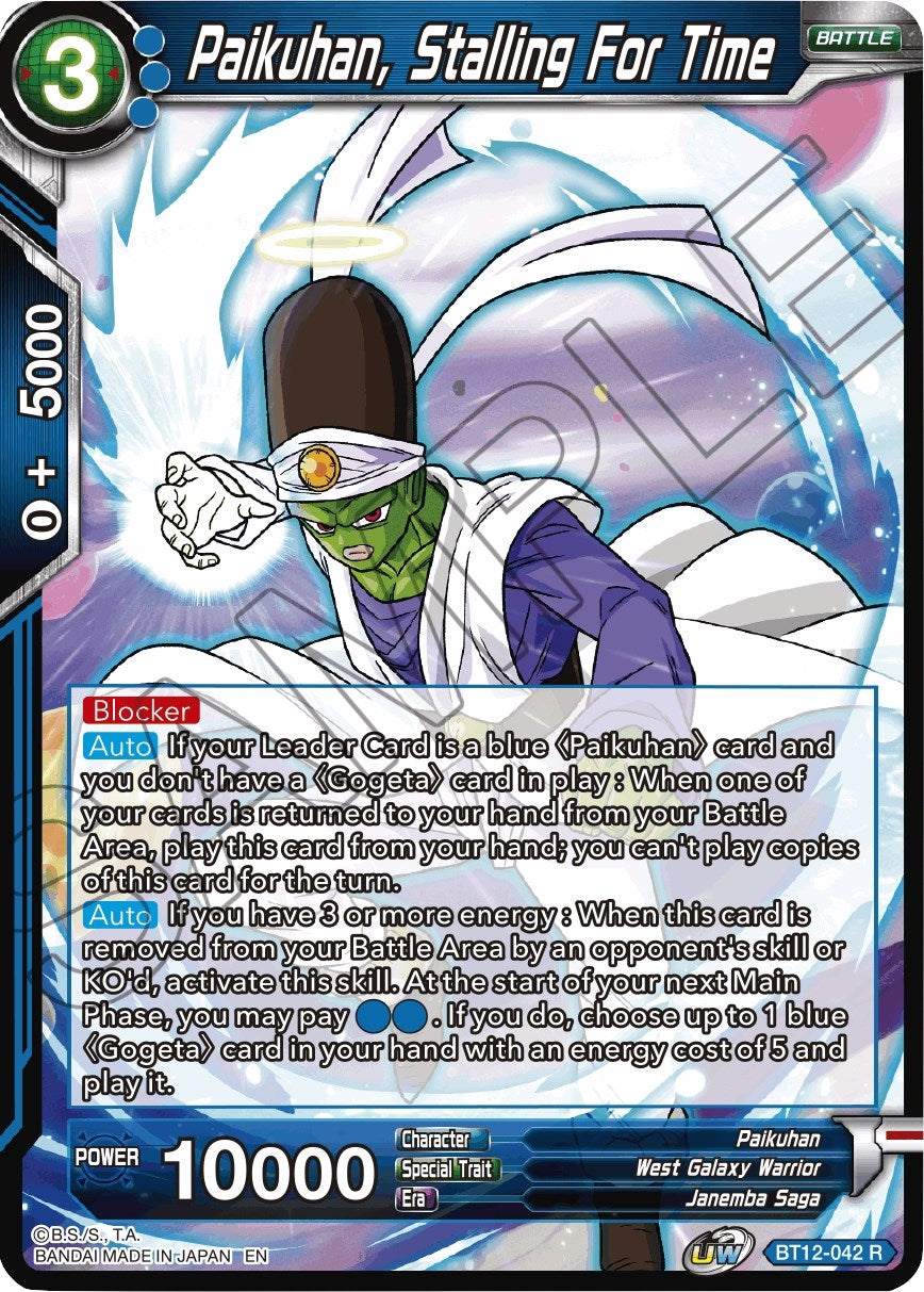 [Auto] If your Leader Card is a blue "Paikuhan" card and you don't have a "Gogeta" card in play : When one of your card is returned to your hand from your Battle Area, play this card from your hand; you can't play copies of this card for the turn. [Auto] If you have 3 or more energy : When this card is removed from your Battle Area by an opponent's skill or KO'd, activate this skill. At the start of your next Main Phase, you may pay BB. If you do, choose up to 1 blue "Gogeta" card in your hand with an energy cost of 5 and play it. |