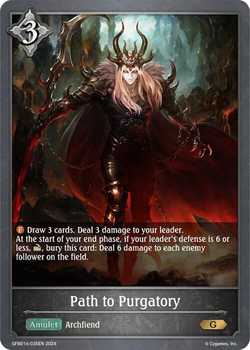 Description: | [Fanfare] Draw 3 cards. Deal 3 damage to your leader. At the start of your end phase, if your leader's defense is 6 or less, [Engage], bury this card: Deal 6 damage to each enemy follower on the field. |
