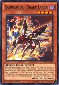 Once per turn, during your Main Phase, if this card was Normal or Special Summoned this turn: You can target 1 face-up Attack Position monster on the field; change it to face-up Defense Position. During your Main Phase 2, if this card attacked this turn: You can target 1 "Raidraptor" monster in your Graveyard; Special Summon it. You can only use this effect of "Raidraptor - Sharp Lanius" once per turn.