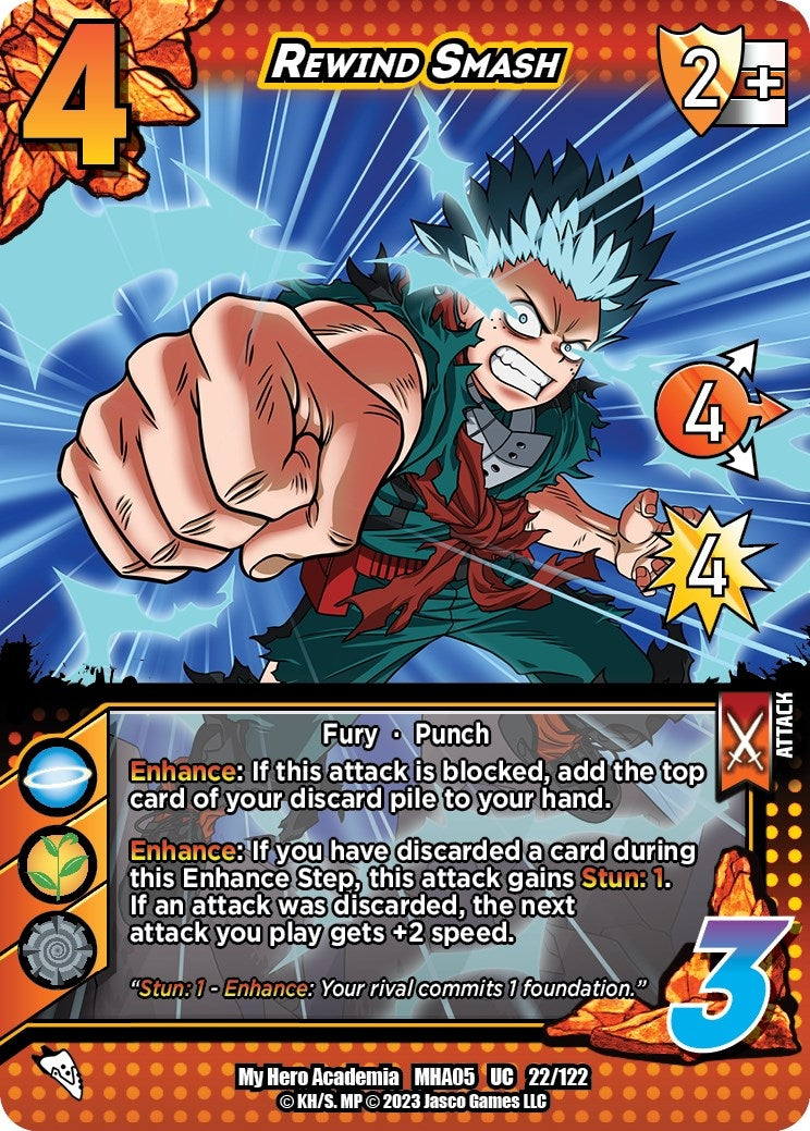 Enhance: If you have discarded a card during this Enhance Step, this attack gains Stun: 1. If an attack was discarded, the next attack you play gets +2 speed. "Stun: 1 - Enhance: Your rival commits 1 foundation." |