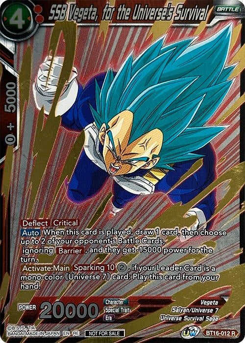 [Auto] When this card is played, draw 1 card, then choose up to 2 of your opponent's Battle Cards, ignoring [Barrier], and they get -15000 power for the turn. [Activate: Main] [Sparking 10] 2, if your Leader Card is a mono-color "Universe 7" card: Play this card from your hand. |
