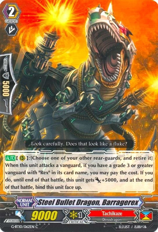[AUTO](RC): [Choose one of your other rear-guards, and retire it] When this unit attacks a vanguard, if you have a grade 3 or greater vanguard with "Rex" in its card name, you may pay the cost. If you do, this unit gets [Power]+5000 until end of that battle, and at the end of that battle, bind this unit face up.
